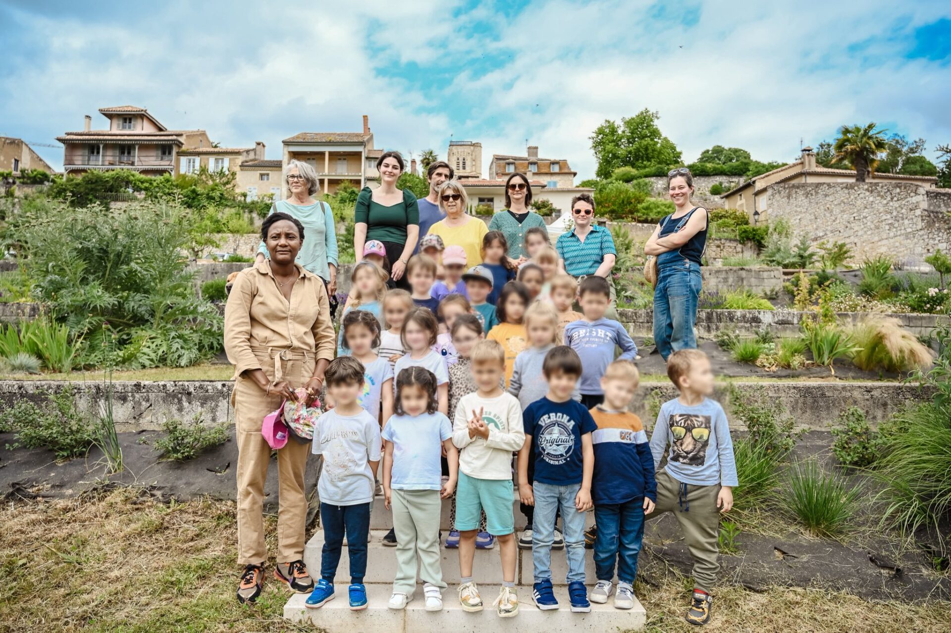 Emma Ménard, Aurélie Bégou du Pays Portes de Gascogne, les artistes Nathalie Brevet et Hughes Rochette, Odile Schaap adjointe à la culture, la directrice de l’école maternelle « La Ribambelle », Viviane Ghesquière accompagnée de Sylvie Tonello, ont fait visiter, vendredi 6 juin, le Jardin deu Hountanèr à deux classes de la maternelle, de 14h à 15h15.