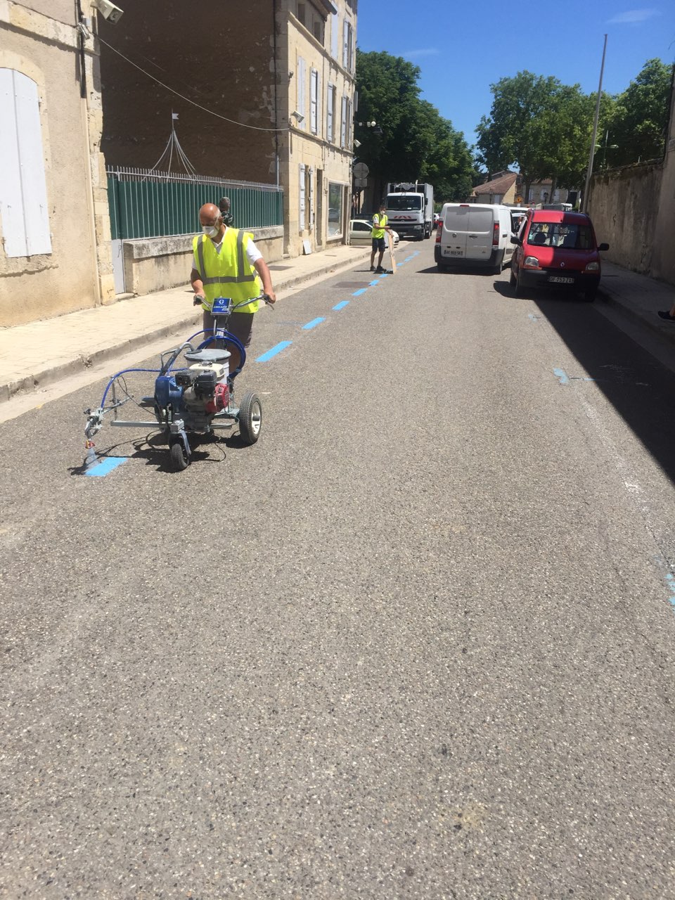 - Ce vendredi, après le marché , les services techniques ont profité qu’aucun véhicule ne stationne rue Nationale pour tracer tous les marquages de la zone bleue.